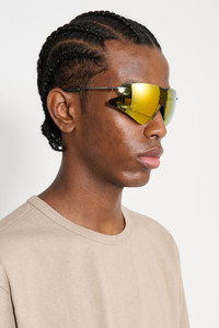 Sunglasses from District Vision. Made in Japan with a lightweight 22g beta titanium frame for durability and comfort. Rimless six-base blade design enhances field of vision and airflow. Features custom-anodized hardware, hypoallergenic rubber nose pads and temple tips. Engineered for high-performance environments with a fully customizable fit. D+ lenses in shatterproof polycarbonate with anti-reflective and oleophobic coatings provide UVA/B protection. Details Grey and titanium frame with copper tinted and mirrored glasses. Made in Japan.ART. NO: DVG012 Size & fit Frame width 14.5 cm. Temple length 13 cm.