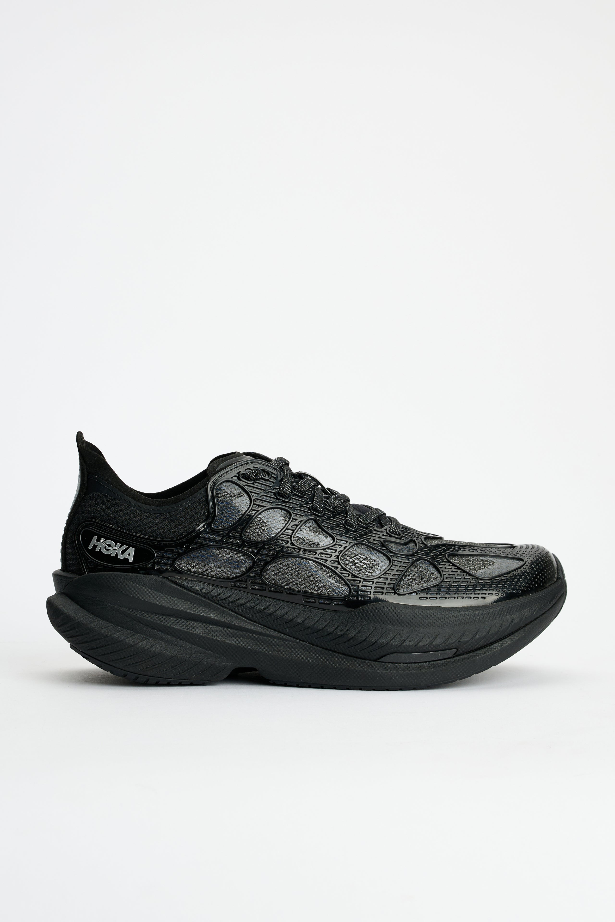 Sneakers from HOKA. Flow-molded caged upper with translucent mesh underlay and textured heel lining. Features reflective detailing, internal cage, HOKA logo at the outer heel, highly resilient PEBA foam midsole, Meta-Rocker geometry, and sticky rubber outsole. Details Black and blue sneakers. Made in Vietnam from textile upper and rubber sole.ART. NO: 1168932-BMD Size & fit US 10 equals UK 9,5 / EU 44.