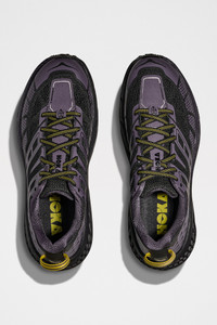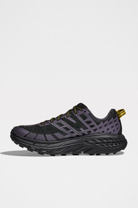 Sneakers from HOKA. Trail running style designed with an open engineered mesh upper for breathability and support. Features a wide CMEVA foam midsole for cushioned stability and a Vibram® MegaGrip outsole with 5mm lugs for enhanced traction. Details Black and purple sneakers. Made in Vietnam. Textile, leather and rubber upper. Textile lining and insole. Rubber outsole.ART. NO: 1162710-BSQ Size & fit US 10 quals UK 9,5 / EU 44.