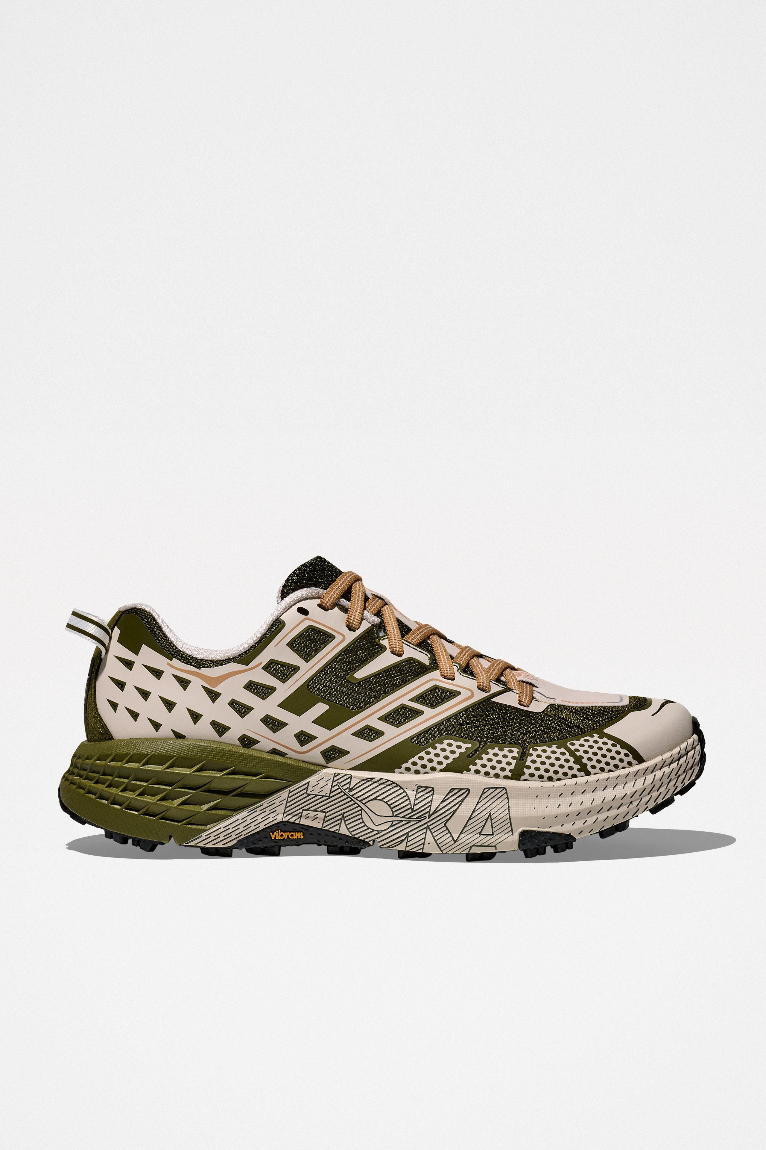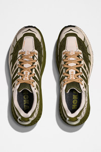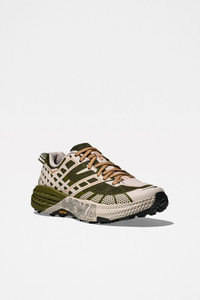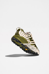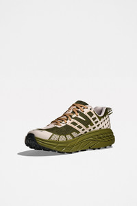 Sneakers from HOKA. Trail running style designed with an open engineered mesh upper for breathability and support. Features a wide CMEVA foam midsole for cushioned stability and a Vibram® MegaGrip outsole with 5mm lugs for enhanced traction. Details Green and cream white sneakers. Made in Vietnam. Textile, leather and rubber upper. Textile lining and insole. Rubber outsole.ART. NO: 1162710-MRSC Size & fit US 10 quals UK 9,5 / EU 44.