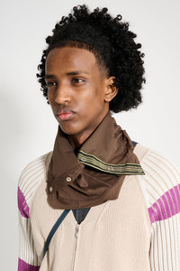 Scarf from Kiko Kostadinov. Made from black cotton jersey with asymmetric construction. Features text embroidery at the face, a press-stud placket with grosgrain trim, and raw edge at the collar. Pleats and bonded trim at the side and back. Adjustable bungee-style cord at the back. Details Brown scarf. Made in Portugal from 100% cotton.ART. NO: KKSS25GTR01-122 Size & fit Measures 30.5 x 32 cm.