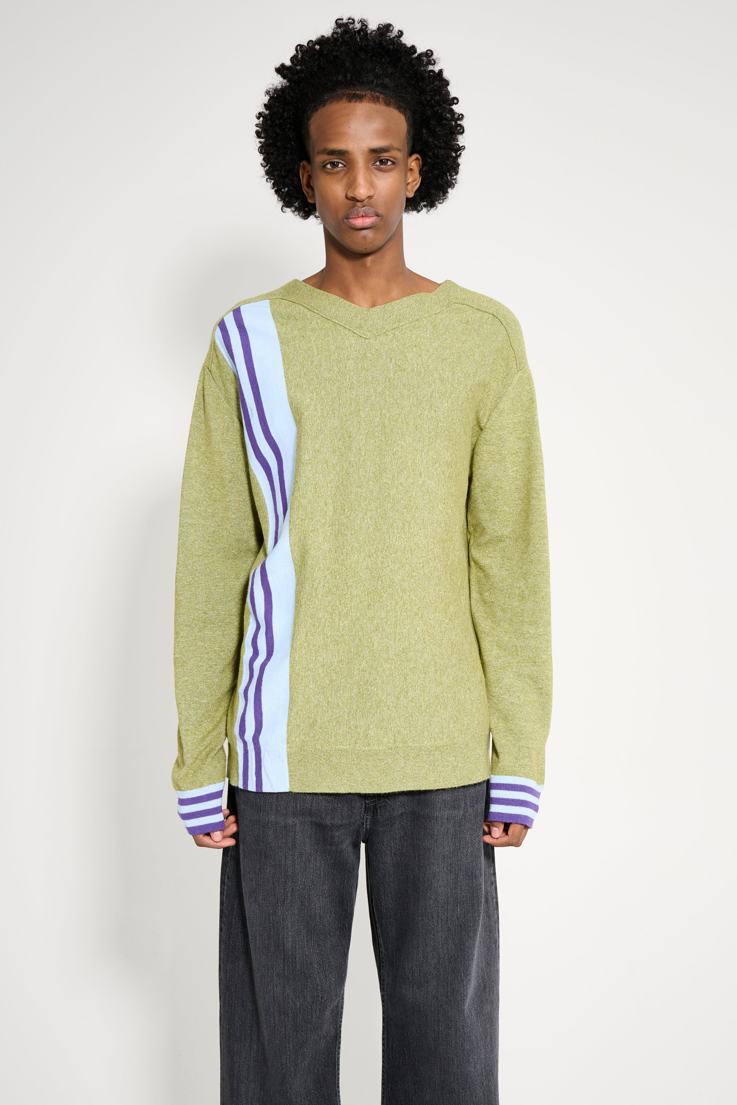 Sweater from Kiko Kostadinov. Made from a virgin wool-blend with melange and striped fabric. Features a high V-neck ribbed collar, ribbed cuffs, and raised seams at the collar and shoulders. Jacquard stripes at the front and cuffs. Details Green, blue and purple sweater. Made in China from 33% virgin wool, 27% polyester, 22% polyacrylic and 18% nylon. Trim: 95% cotton and 5% cashmere.ART. NO: KKSS25KN02-106 Size & fit Model wears a size 48 and measures 184 cm with a 83 cm chest.