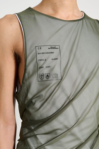 Tank top from Olly Shinder. Made in the United Kingdom from stretch cotton jersey for the lining and a thin, see-through nylon organza outer layer. Features a crewneck, logo graphic printed at the chest, and ruching at the hem. Details Green and white tank top from Olly Shinder. Made in the United Kingdom from 95% cotton and 5% elastane, with trim crafted from 100% polyester.ART. NO: UW02AW24-GW Size & fit Layered tank top with a snug fit. Model wears a size L and measures 187 cm with a 82 cm chest.