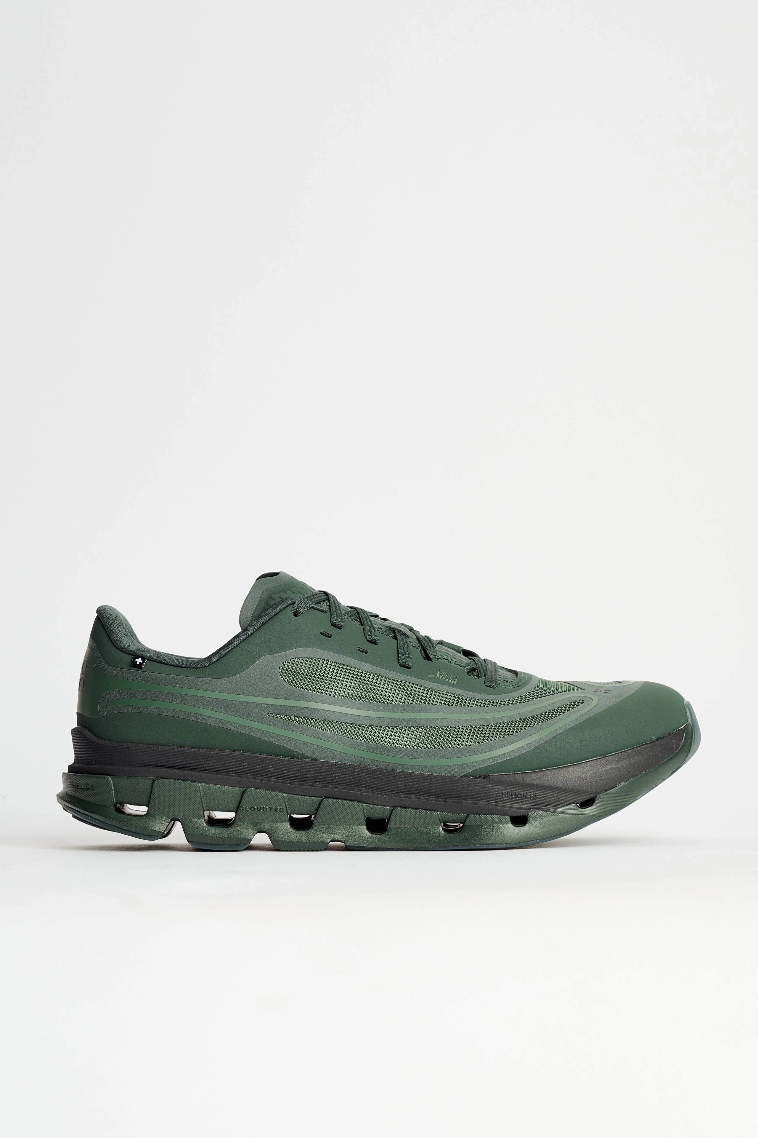Men's green and black sneakers 3D haptic prints Elongated side branding Helion HF midsole Speedboard stability CloudTec cushioning Standard lacing Made in Vietnam Art. no: 3MF30704443 Sneakers from On. The Cloudflow 5 AD pairs a Helion foam midsole with CloudTec cushioning and a Speedboard for stability. A sculpted upper features elongated branding and tactile 3D textures with matte detailing. Standard lacing and a measured 6 mm drop complete these trainers in a streamlined build.