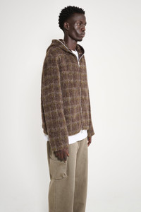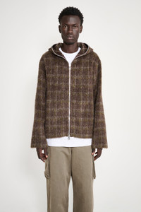 Hooded zip‑up from Our Legacy. Made from an Italian wool blend with a fuzzy, hairy texture and Dorf check pattern. Features a Lampo two‑way full‑length zipper and relaxed, boxy silhouette ending in a straight hem. Details Brown, grey and green zip jacket. Made in Portugal, fabric made in Italy from 35% wool, 26% polyester, 22% acrylic, 11% alpaca, 4% polyester and 2% other fibres. Silver tone Lampo zipper, made in Italy.ART. NO: M4256FD Size & fit Relaxed, boxy fit. Model wears a size 50 and measures 190 cm with an 85 cm chest.