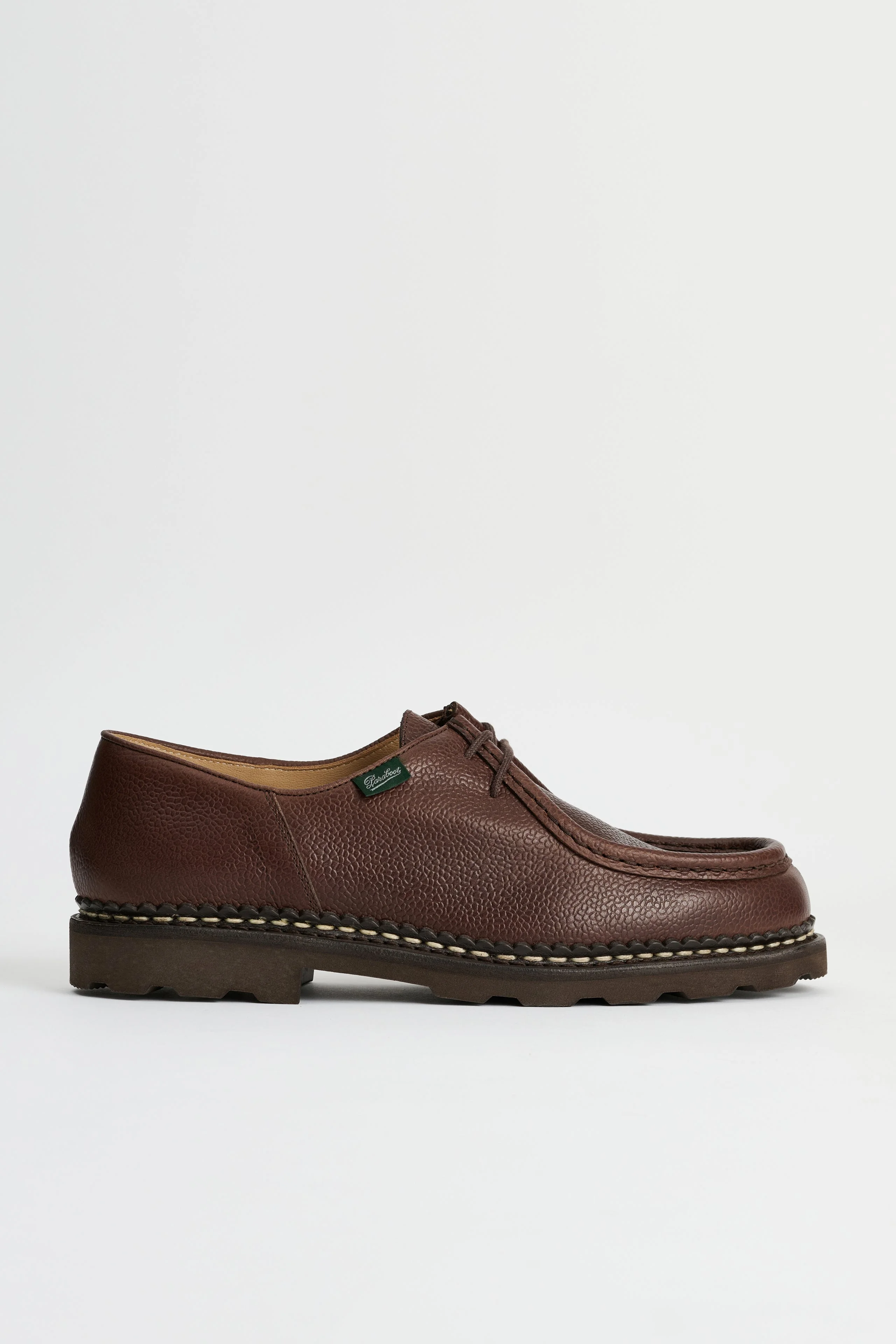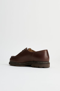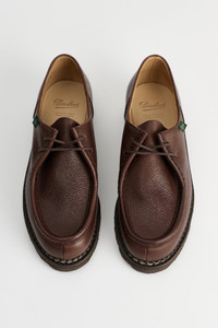 Shoes from Paraboot. The Michael, a moc-toe Derby introduced in 1945, remains one of the brand’s most iconic styles. Handmade in France from grained calf leather with piped seams and a two-eyelet lacing system. Constructed using the Norwegian welt technique for durability, flexibility, and easy resoling. Finished with a leather lining and rubber sole. Details Brown shoes. Made in France from leather and textile. Rubber sole.ART. NO: 715634 Size & fit Listed in European sizes. Men’s EU 44 equals UK 10.