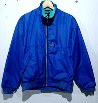 This Vintage Patagonia Bomber Lining Fleece Jacket in size XS is a classic piece made in the USA. Featuring a nylon outer shell with a stand-up collar and full zip closure, this jacket is perfect for casual, travel, or workwear occasions. The retro design with accents like the zipper and logo gives it a unique and timeless appeal. Lined with polyester, this lightweight and wind-resistant jacket also has zipped pockets and an elastic waist, making it a versatile and stylish choice for the fall and winter seasons.