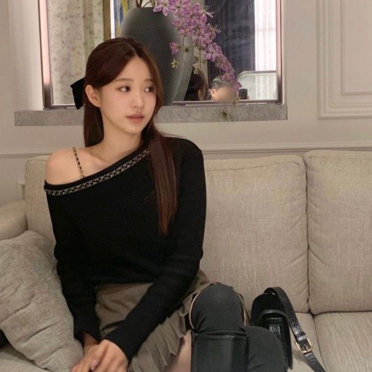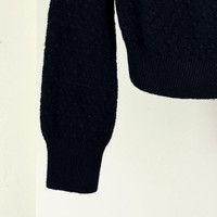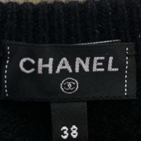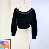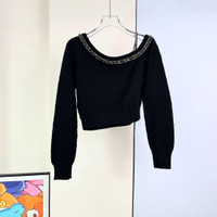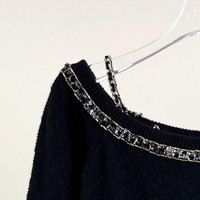 Chanel 23B chain-detailed leather-threaded black cashmere sweater with shoulder strap.