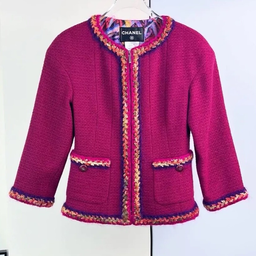Chanel purple-red jacket with contrasting trim and a fitted waist.
