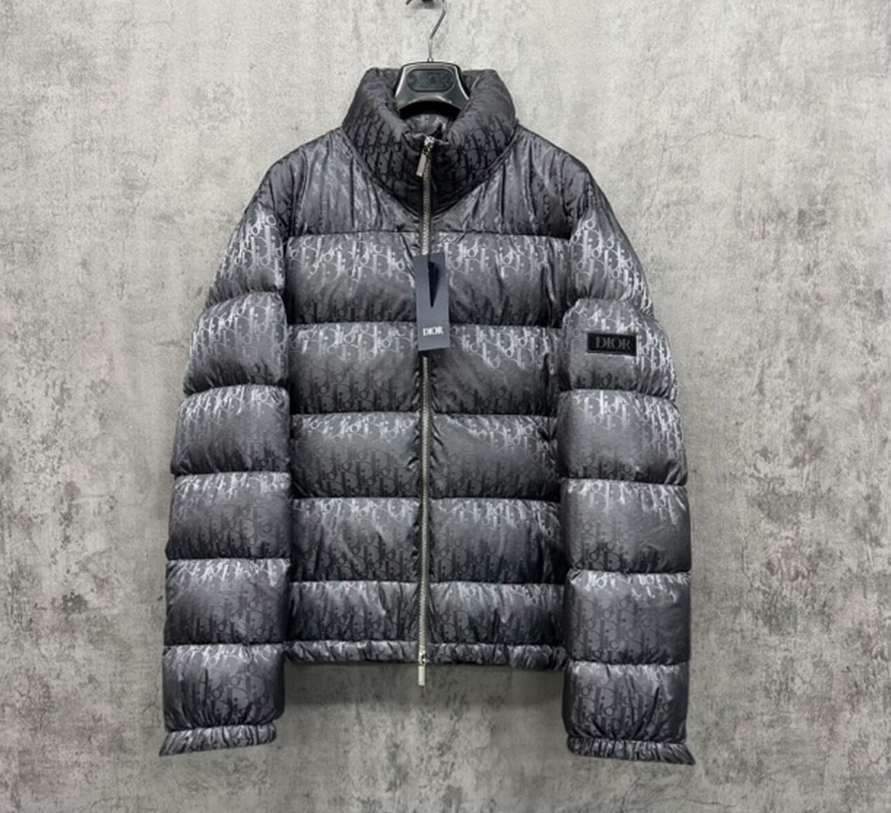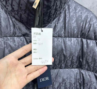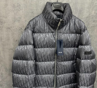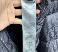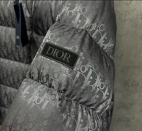 Dior dark grey down jacket with all-over logo embroidery on the sleeve.