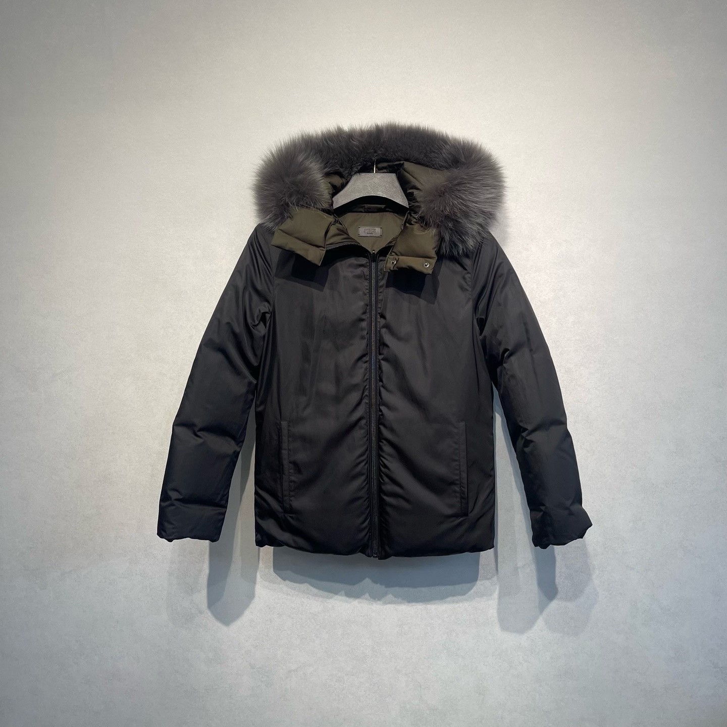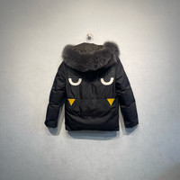 Fendi down jacket with monster pattern and real fur trim.