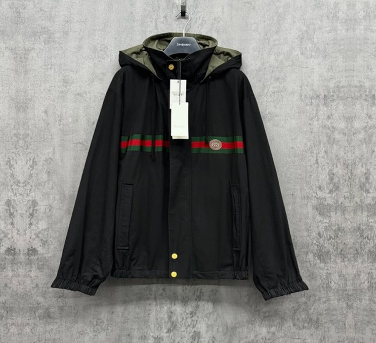 GUCCI heavyweight gold-buttoned reversible jacket with 3D logo.