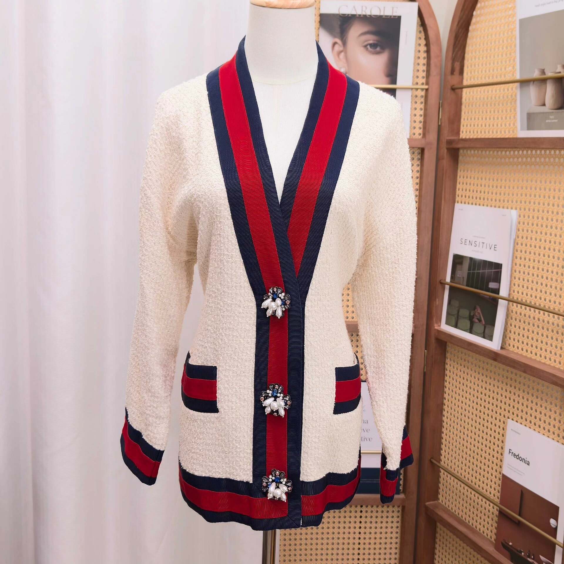 GUCCI/Red and Blue Ribbon Pearl Button Tweed Knit Cardigan