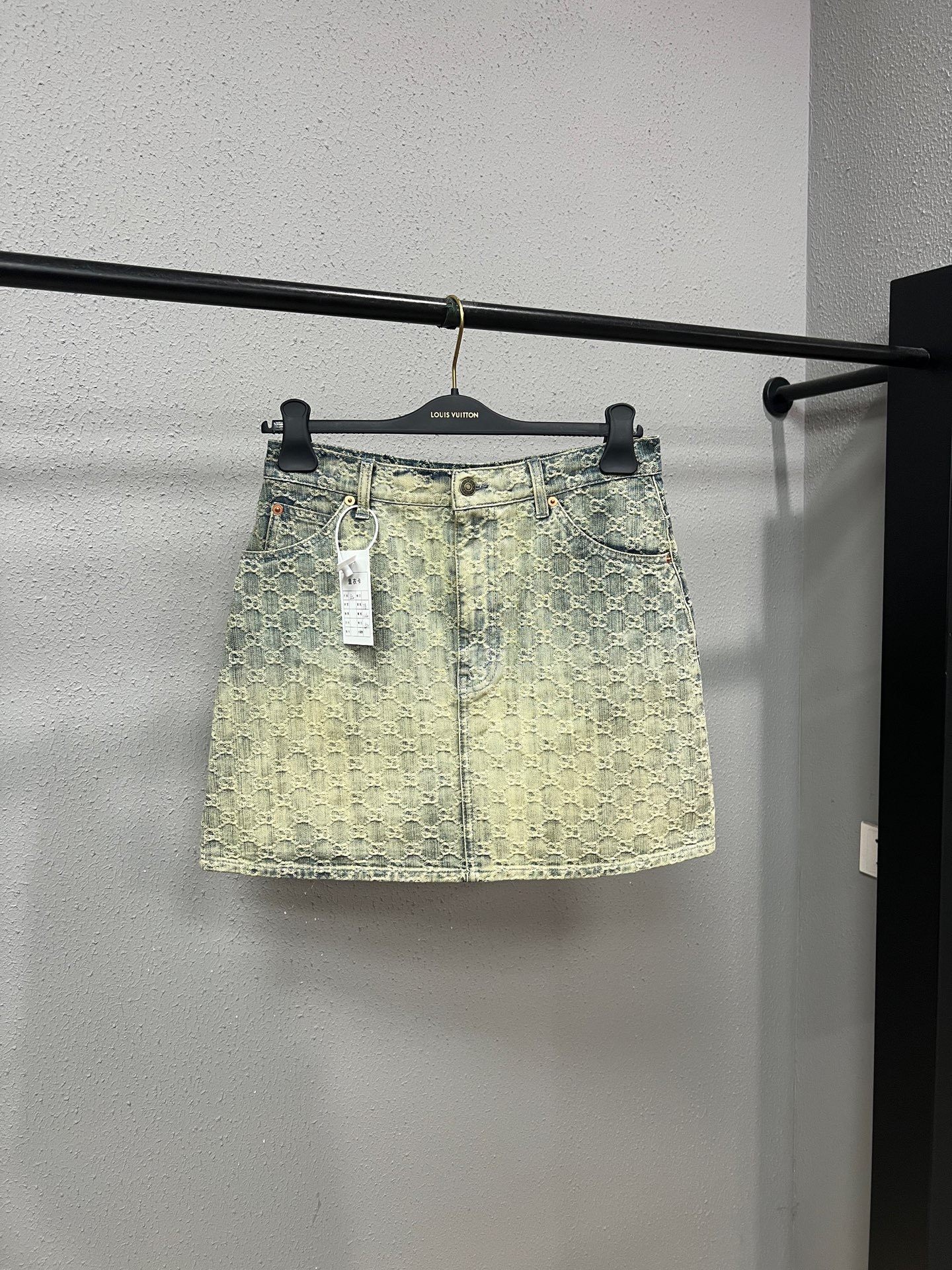 Gucci rhinestone distressed all-over print denim mini skirt