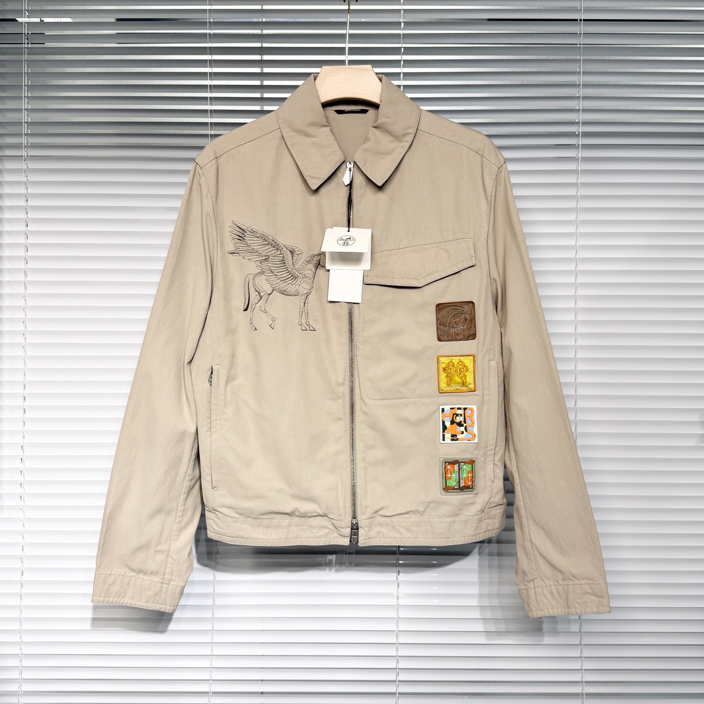 Hermès jacket with Pegasus embroidery, leather patch, and badge.
