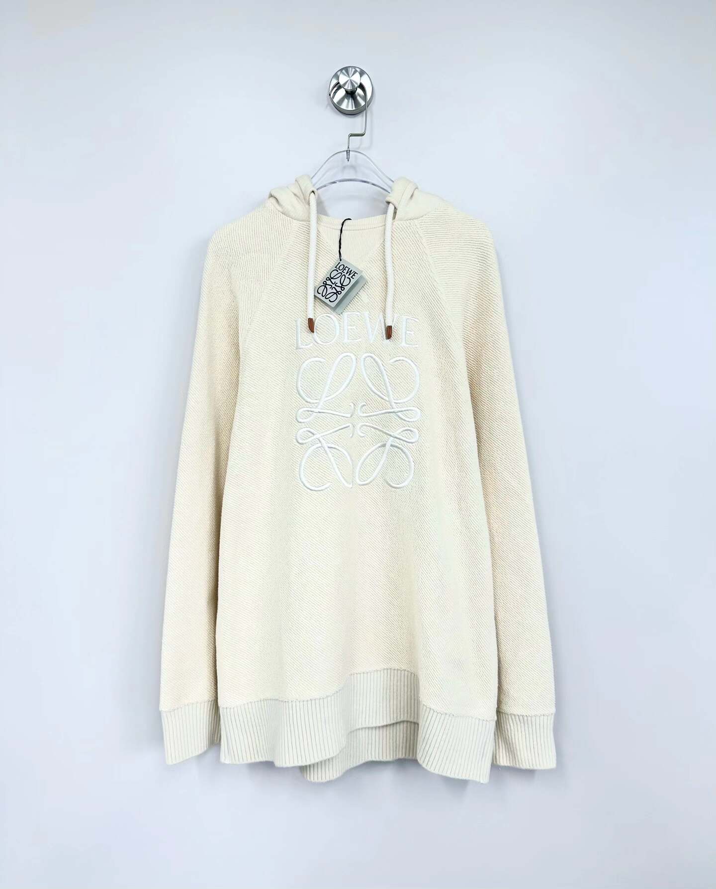 Loewe off-white hooded sweatshirt with embroidered logo lettering.