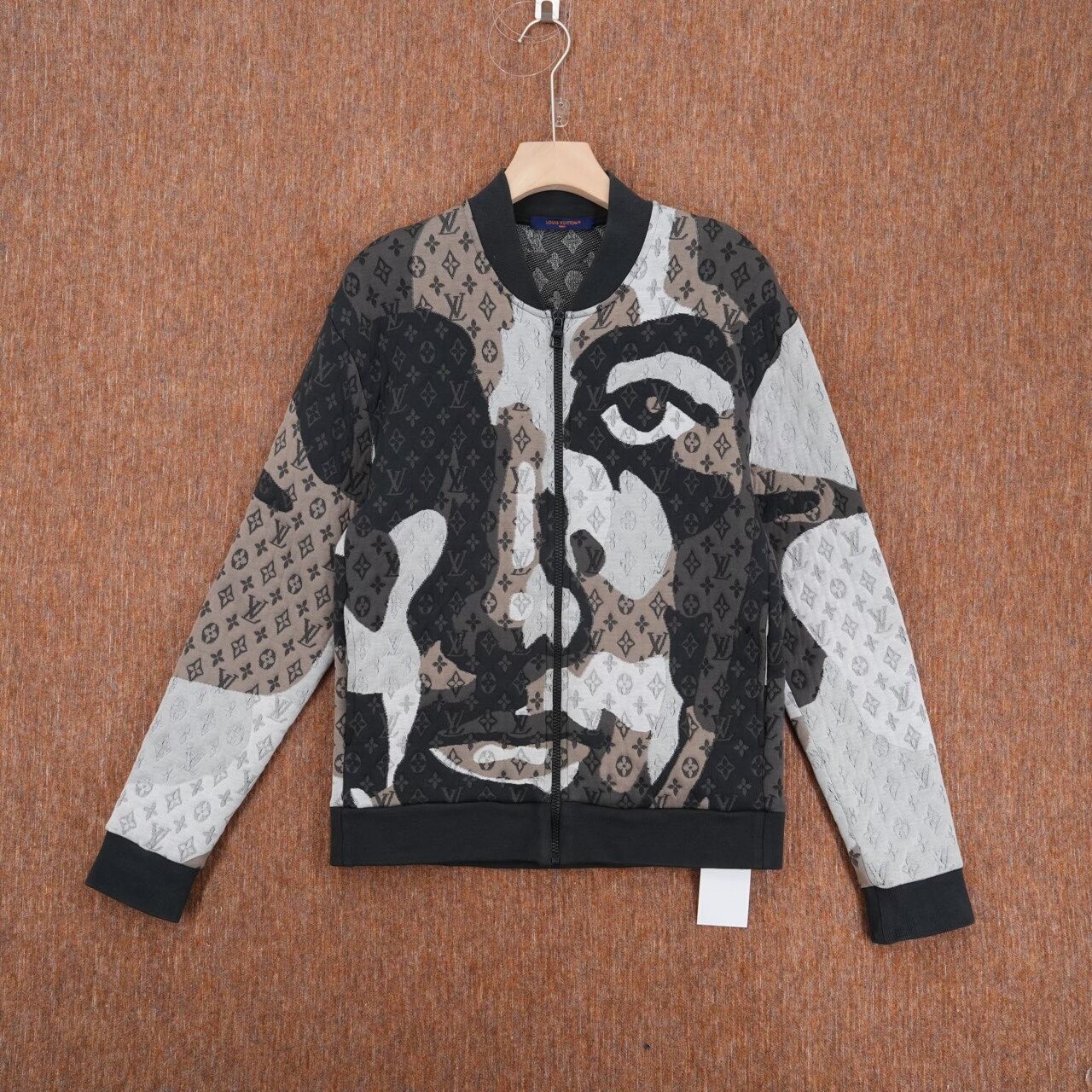 Louis Vuitton baseball jacket with all-over logo and abstract face print.