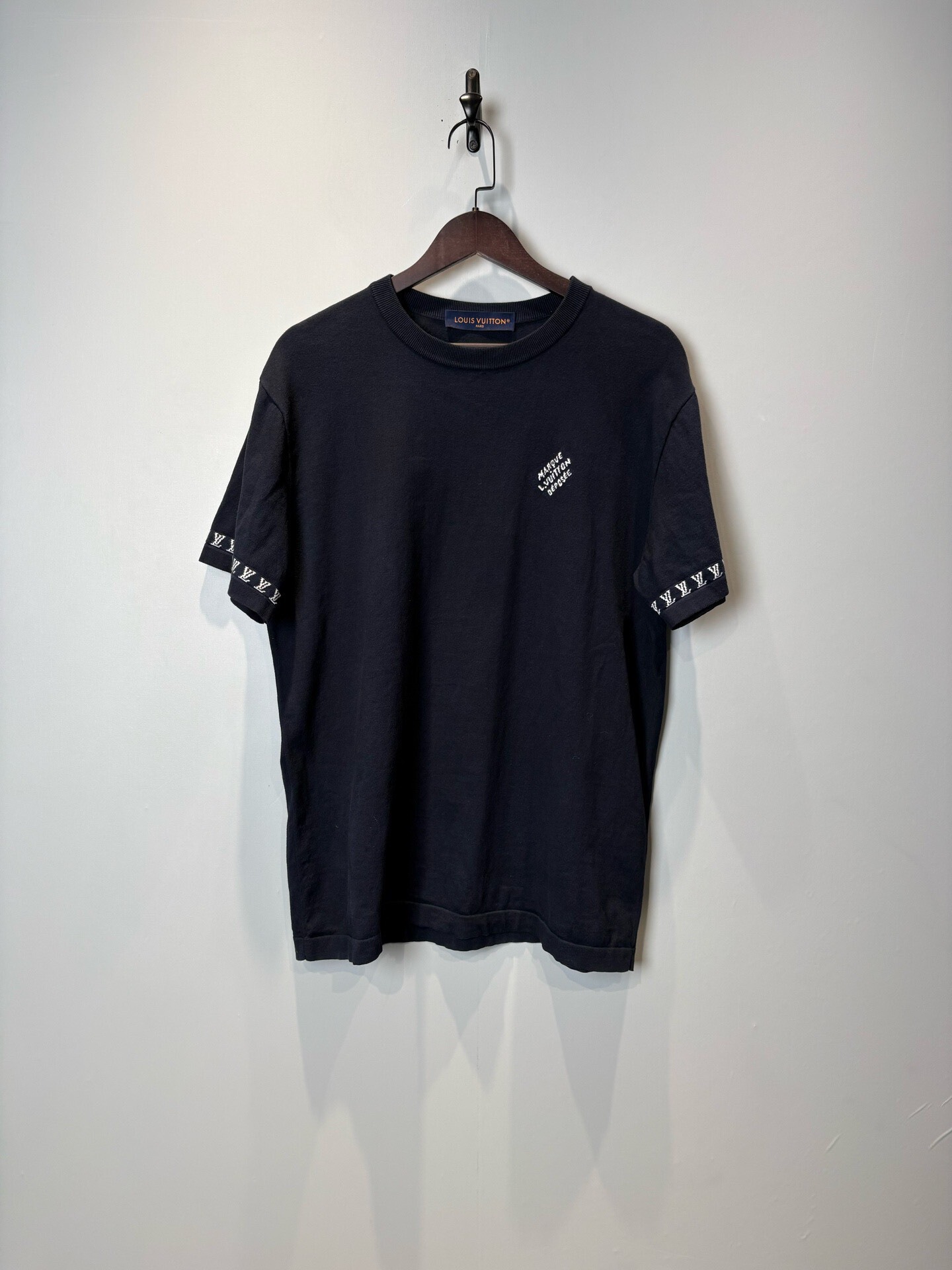 Louis Vuitton FW24 short-sleeved crewneck knit sweater with letter intarsia detail on the cuffs.