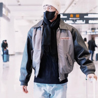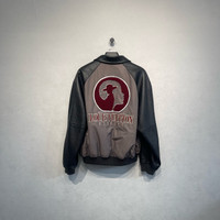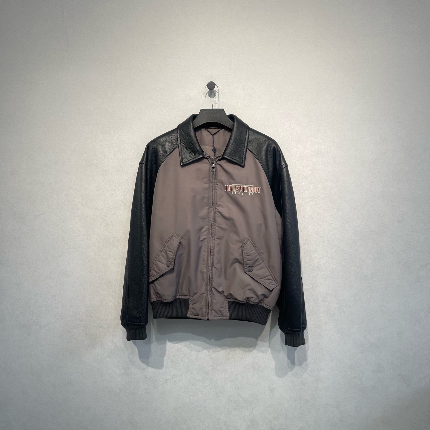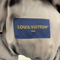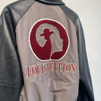 Louis Vuitton gray baseball jacket with embossed logo and leather paneling.