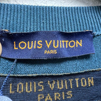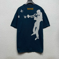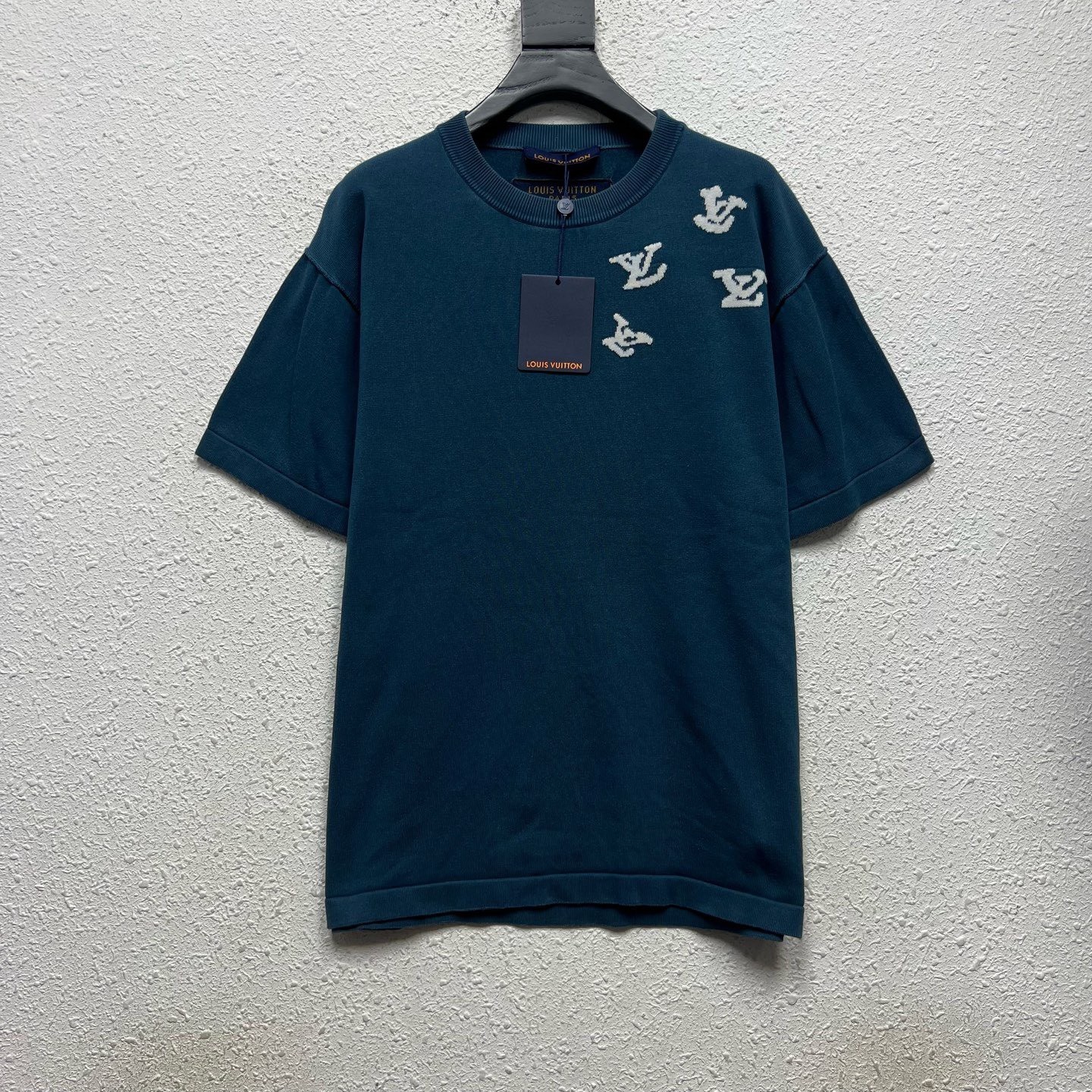 Louis Vuitton LV navy blue short-sleeved knitted top with Piper logo and lettering.