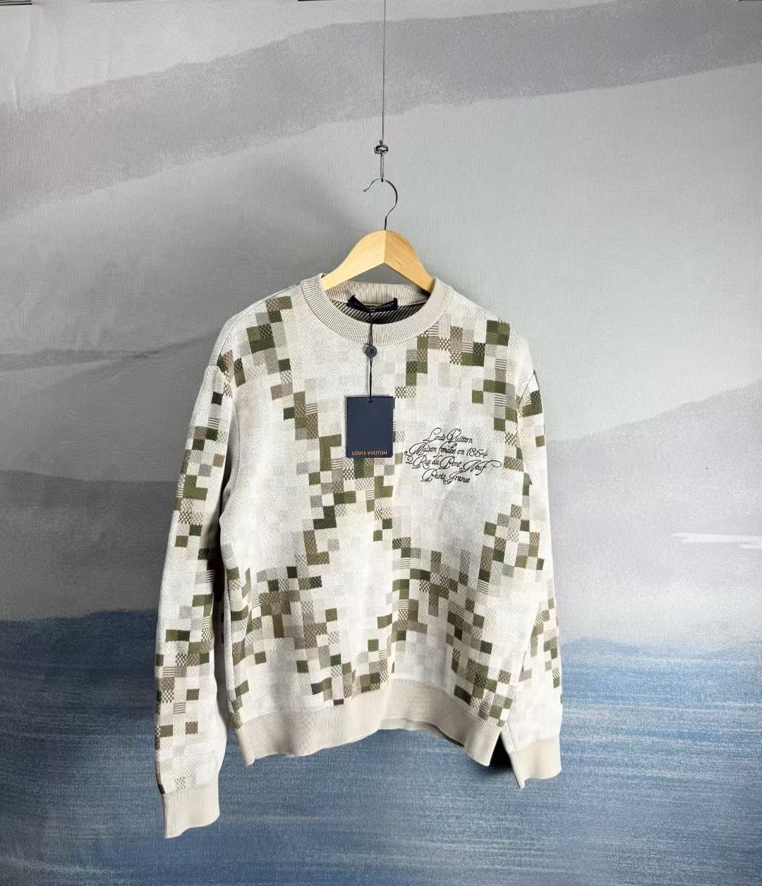 Louis Vuitton LV white camouflage embroidered checkerboard sweater