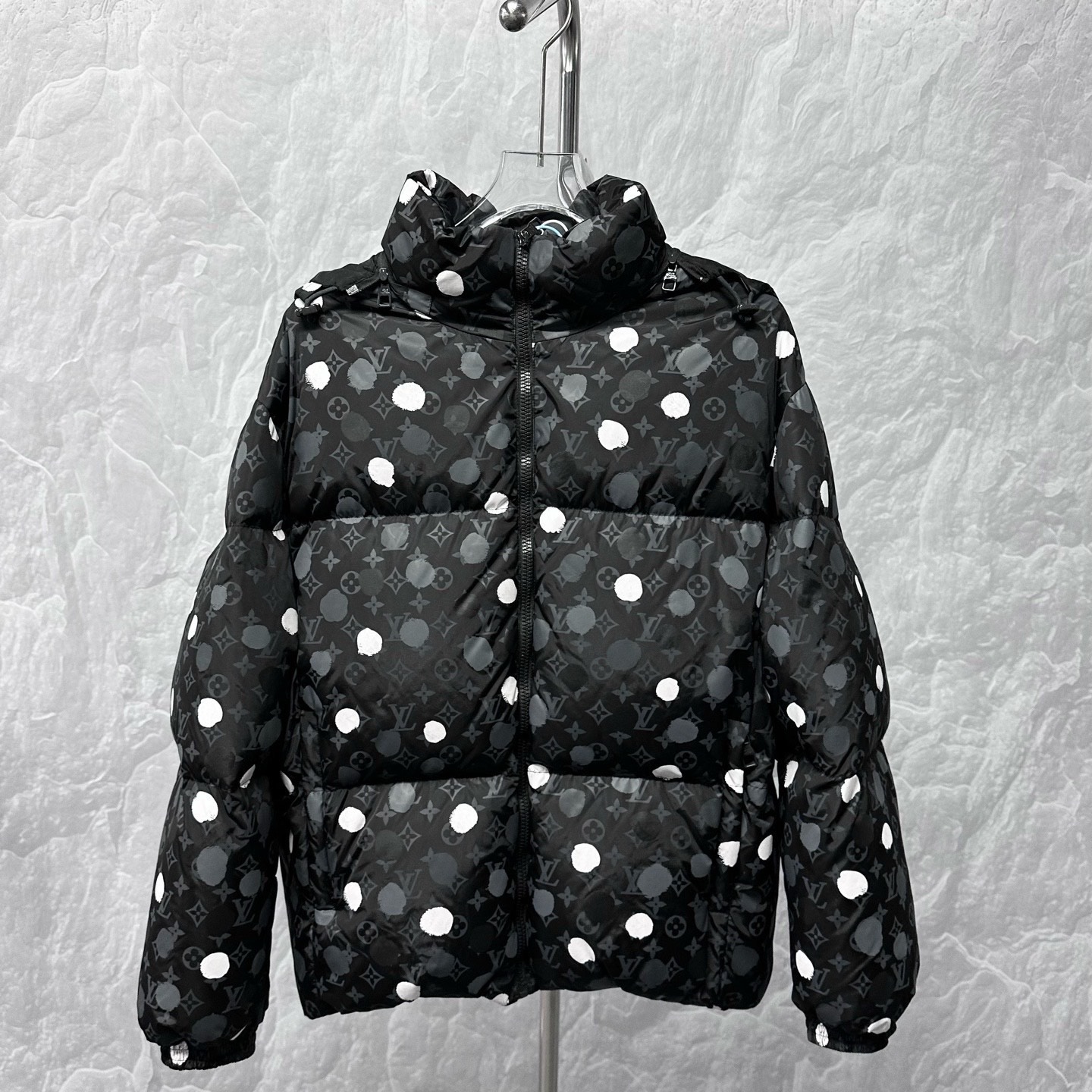 Louis Vuitton LV x Yayoi Kusama collaboration polka dot hooded down jacket with detachable hood.