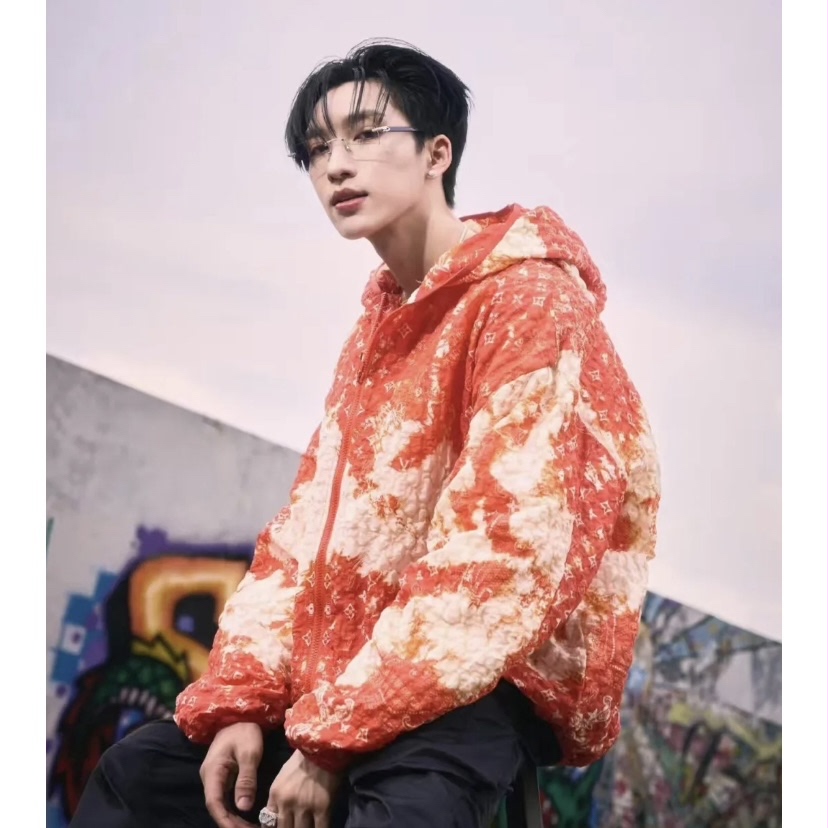 LOUIS VUITTON Orange all-over logo and paisley print zip-up hooded jacket.