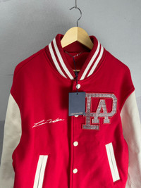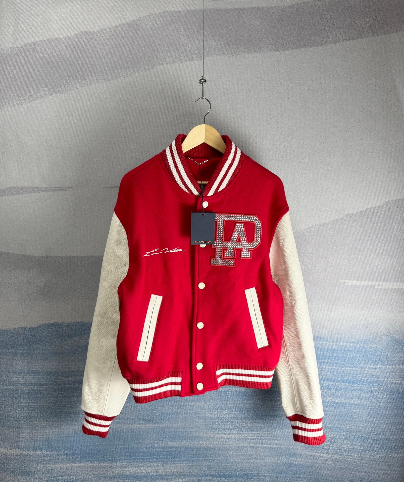 Louis Vuitton Pharrell Williams red and white rhinestone and pearl patchwork leather baseball jacket
