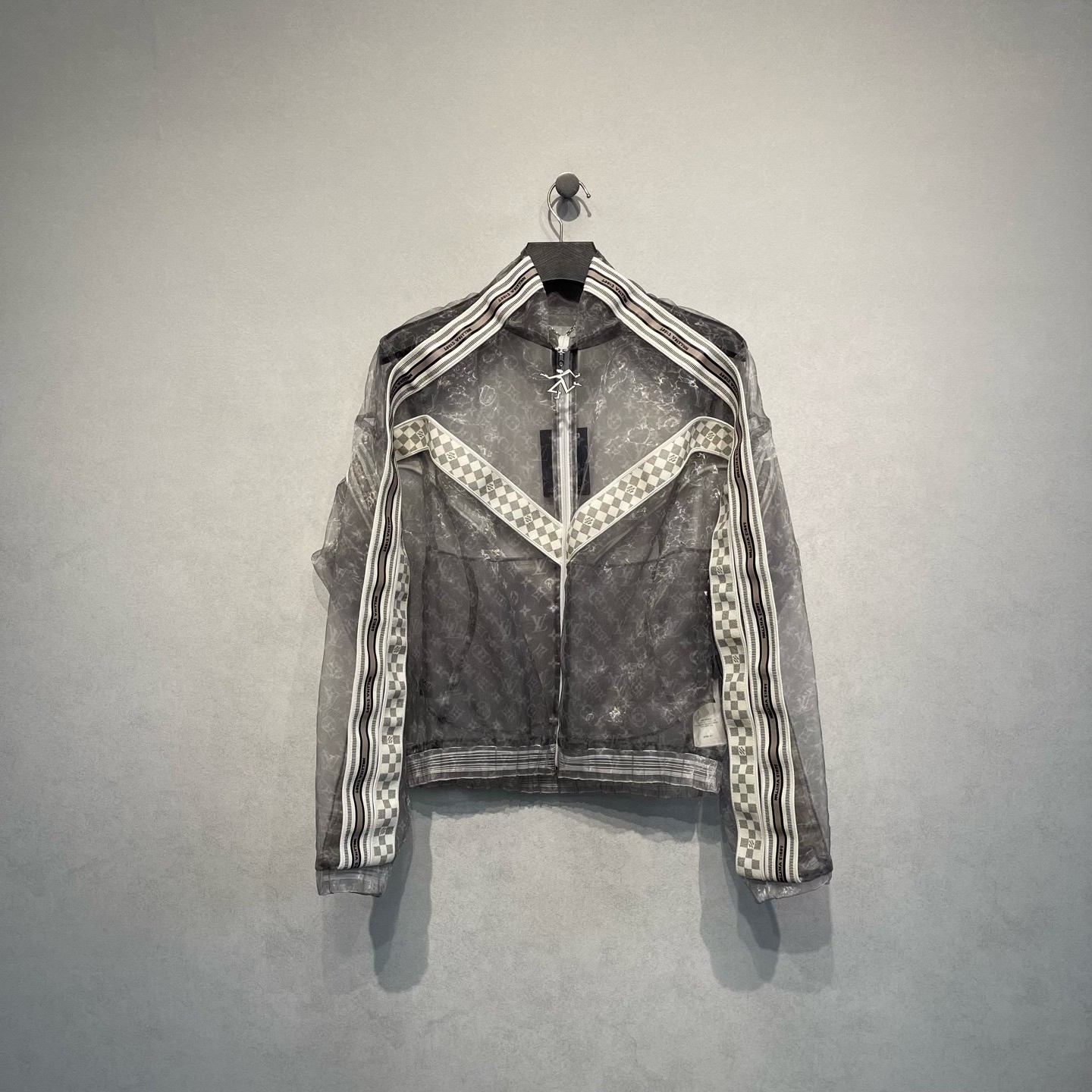 Louis Vuitton runway collection organza jacket with all-over logo print.