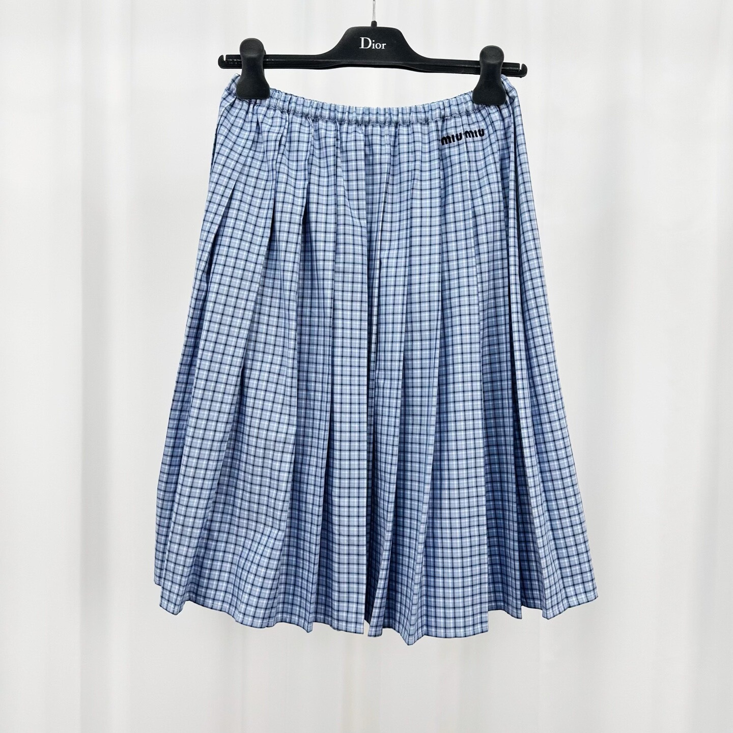 Miu Miu 24SS Embroidered Letter Blue Plaid Pleated Skirt