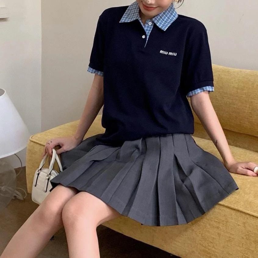 Miu Miu navy blue faux two-piece shirt with knitted short sleeves
