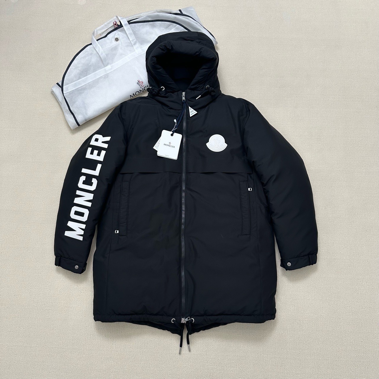 Moncler large logo mid-length down jacket
