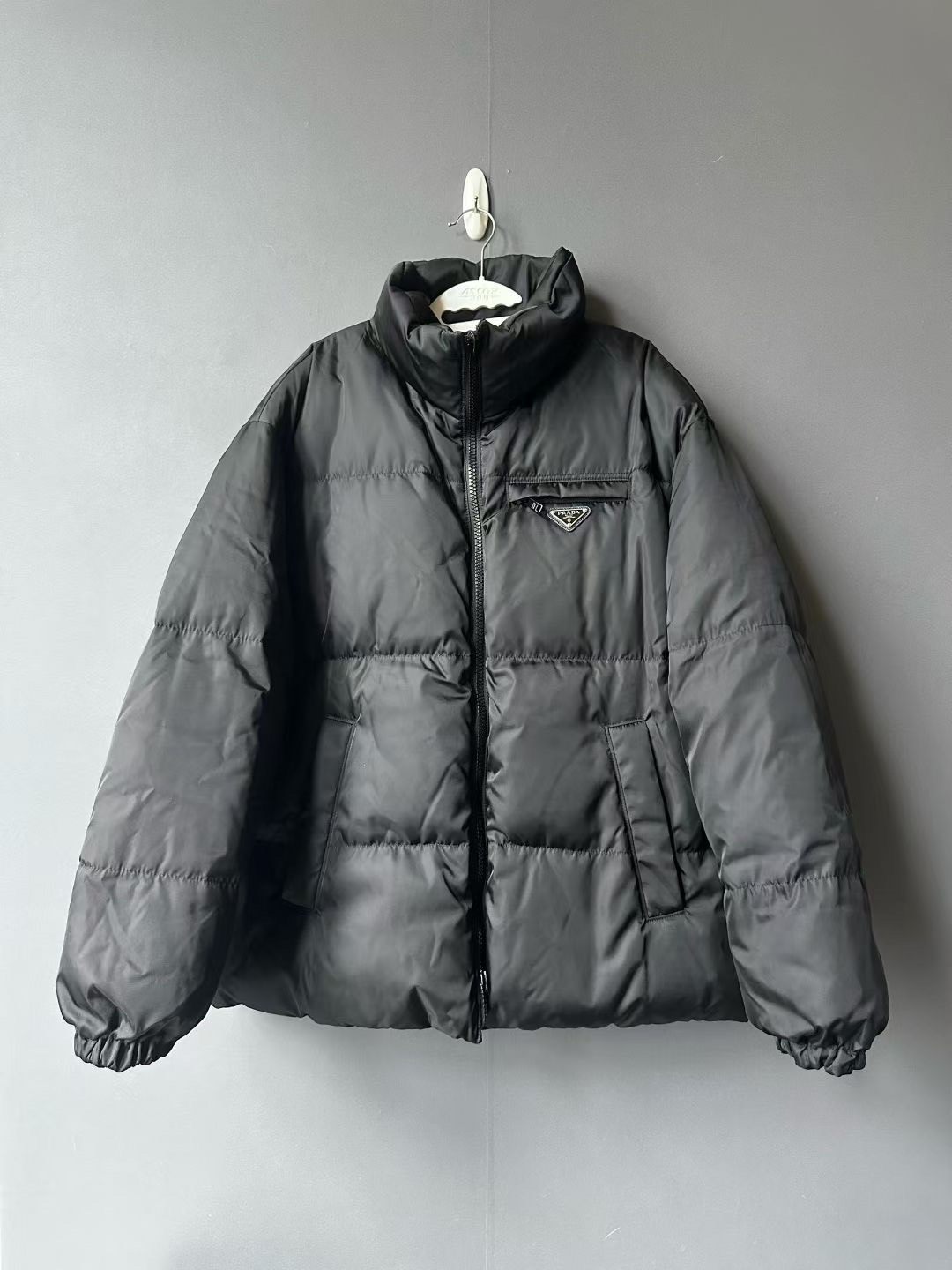Prada black reversible down jacket with triangular logo.