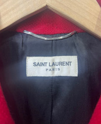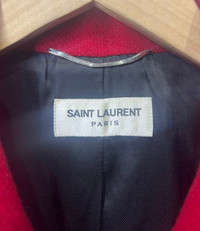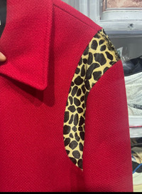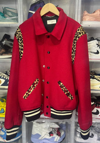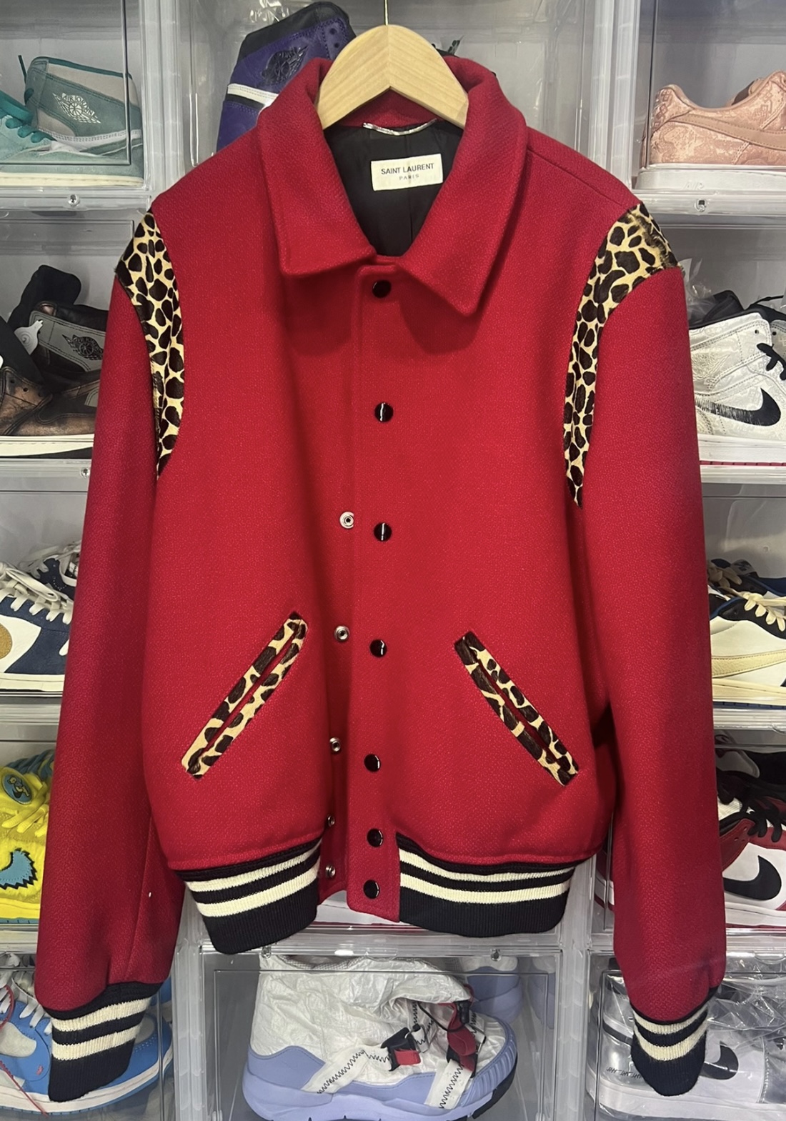 Red fur leopard print baseball jacket by Saint Laurent Hedi