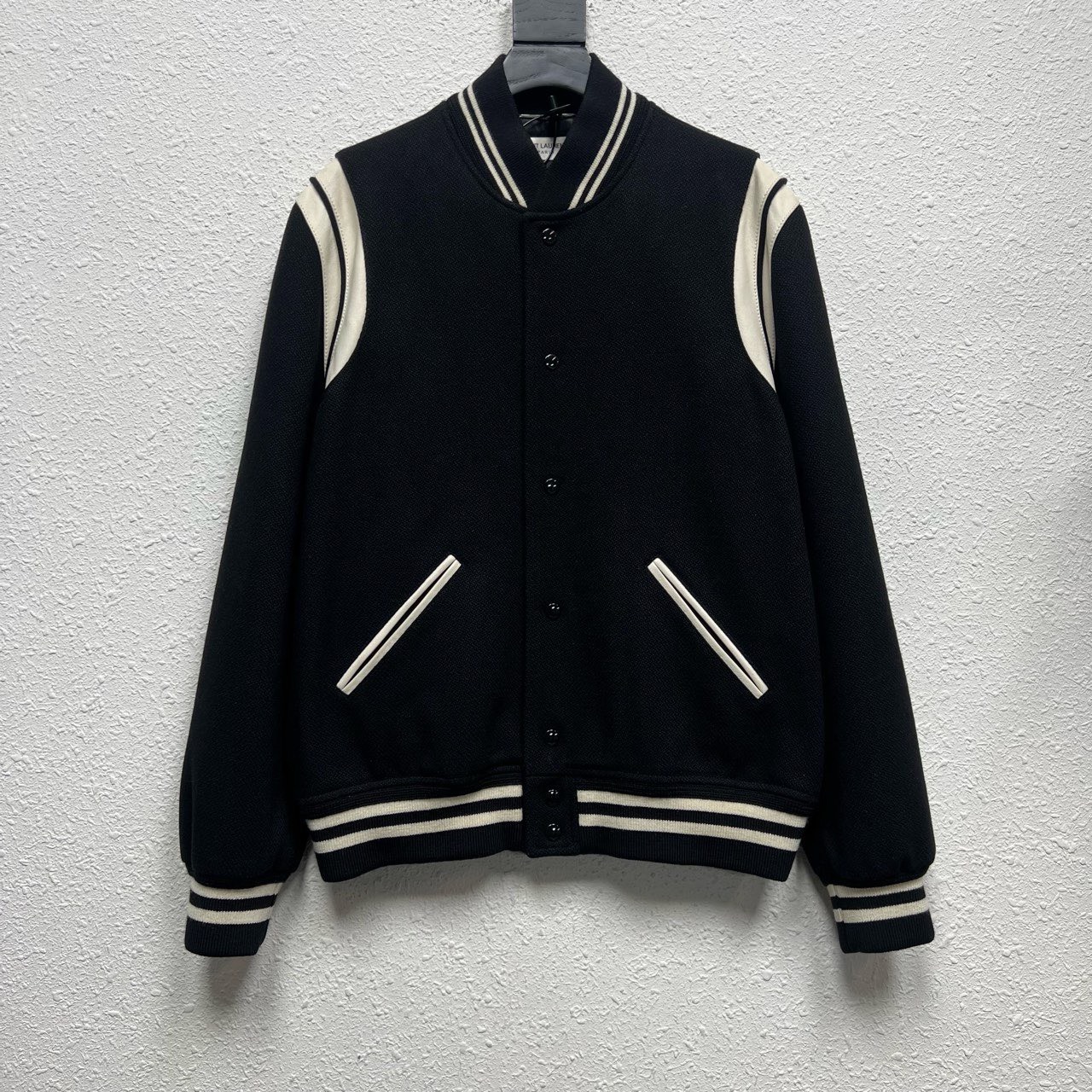 SLP Saint Laurent black and white wool baseball jacket