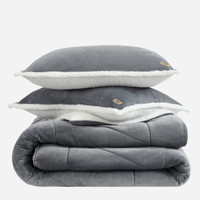 100% polyester comforter set. 110 inchx92 inch comforter with two 20 inchx66 inch shams. The UGG® Logo faux leather label. Packaged in a vinyl bag. UGG® Avery Comforter Set King Polyester Bedding in Seal Grey