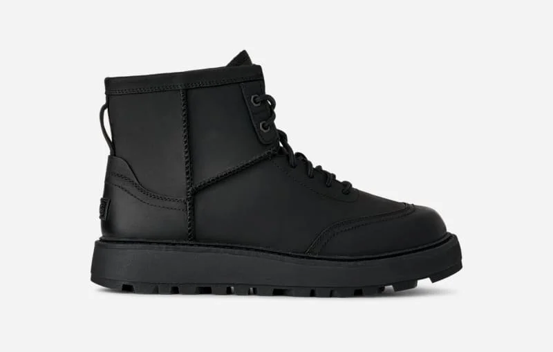 Elevated in style and comfort, our Idyllwild Lace is destined for the front of your footwear rotation. On the outside, it's finished with a uniquely burnished leather upper and Twin Seam detailing. Inside, we've added a soft textile lining and cushy UGG®plush sockliner, while the outsole is crafted with innovative Spider Rubber for enhanced traction.This product was made in a factory that supports women in our supply chain with the help of Reimagining Industry to Support Equality (RISE). This collaborative initiative creates partnerships with brands like ours to empower and educate women in the workplace. Waterproof Features. Seam-sealed construction. Waterproof leather. The Twin Seam detailing, Metal eyelets, Punched eyelets. Non-wicking laces made with 100% recycled polyester fibers. Textile lining, Textile lining made from 90% recycled polyester, 10% Spandex. 10mm UGG®plush 60% upcycled wool, 40% TENCEL Lyocell sockliner. Poured PU footbed incorporates at least 50% bio-based content. Sugarcane EVA midsole. Spider Rubber outsole for traction. The UGG® Logo, heat-embossed. RN 88276. UGG® Men's Idyllwild Lace Leather Boots in Black/Black, Size 7.5