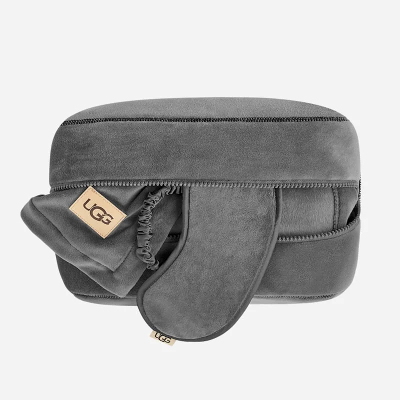 Velour 3pc travel set. 100% Polyester. The UGG® Logo faux leather label. 65 inchx40 inch Throw (1), 6.6 inchx5.5 inchx12 inch Carrying Case (1), 3.5 inchx8 inch Eyemask (1). UGG® Raegen Travel Set Polyester Blankets in Charcoal
