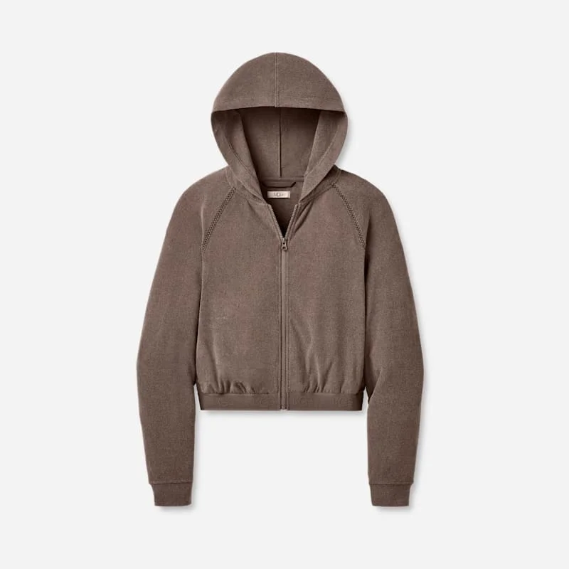 Inspired by the vintage hoodie of your dreams, our Aubrie Zip Hoodie is designed with our super soft brushed knit, diamond stitch seam details, and The UGG® Logo along the hem. Crop-length classic-fit full zip hoodie. Self - 92% Recycled Polyester/8% Elastane. Lining - Unlined. Diamond stitch seam detail. Raglan sleeves. Self cuffs. Side seam pockets. The UGG® Logo elastic bottom hem. 20 5/8 inch HPS Length [Size S]. Imported. UGG® Women's Aubrie Zip Hoodie Polyester Tops in Oyster Brown, Size S