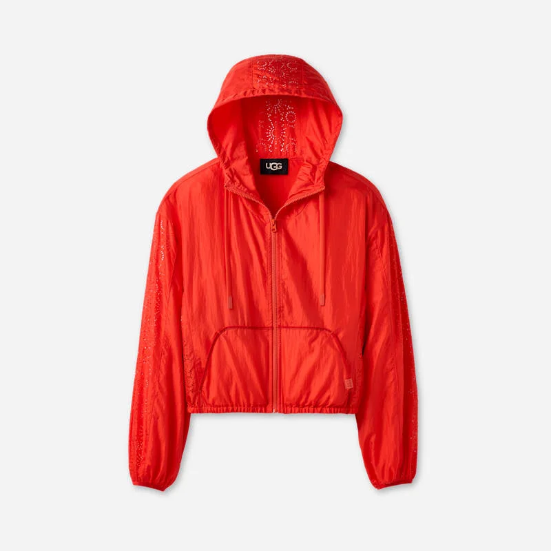 She's here and she's lovely-our Chiara Full-Zip Hooded Jacket combines our feather-light sunweave fabric with our laser-cut sheer Sun Logo Shape for a playful peekaboo moment. We made this mashup of a sporty technical jacket and delicate detailing for all-day, every-day wear. Layer it over your go-to denim or pair it with our matching Giavanni Balloon Cargo Pant for a head-to-toe wow moment.This product was made in a factory that supports women in our supply chain with the help of Reimagining Industry to Support Equality (RISE). This collaborative initiative creates partnerships with brands like ours to empower and educate women in the workplace. Relaxed-fit lightweight hooded full-zip jacket. Self - 100% Nylon. Lining - Unlined. Elasticized hemline. Vislon zipper. Kangaroo pockets. Drawcord with The Graphic UGG® Font faux suede tips. The Sun Logo Shape laser cut details. The Graphic UGG® Font faux suede label. Elastic Binding on Kangaroo Pocket and Cuff Opening. 22 inch HPS Length [Size S]. 26 inch HPS Length [Size 2X]. Pairs with the Giavanni Balloon Cargo Pant. Imported. This product was made in a factory that supports women in our supply chain with the help of Reimagining Industry to Support Equality (RISE). This collaborative initiative creates partnerships with brands like ours to empower and educate women in the workplace.. UGG® Women's Chiara Full-Zip Hooded Jacket Tops in Lobster, Size S