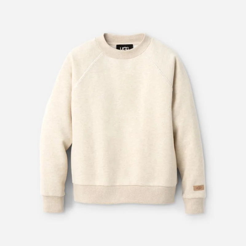It's called the Classic Crewneck for a reason. Our Classic Crewneck embodies the spirit of our Classic Boot in an equally cozy sweatshirt. Designed with brushed-back fleece and whipstitch detailing, this is one crewneck you won't want to lend out. Wear it with our Classic Sweatpant or Classic Wide Leg, and thank us later. Oversized-fit crewneck sweatshirt with raglan sleeves. Self - 55% Responsible Cotton/45% recycled polyester. Responsible Cotton means: responsible cotton sourcing scheme cotton, recycled cotton, or organic cotton. Rib knit - 96% cotton/4% elastane. Lining - Unlined. Whipstitch detail on seams. The UGG® License Plate leather label on wearer's left sleeve. 25 inch HPS length [size S]. 29 1/2 inch HPS [size 2X]. Pairs with the Classic Sweatpant. Imported. UGG® Women's Classic Crewneck Cotton Blend/Recycled Materials Tops in Sand Heather, Size 1X