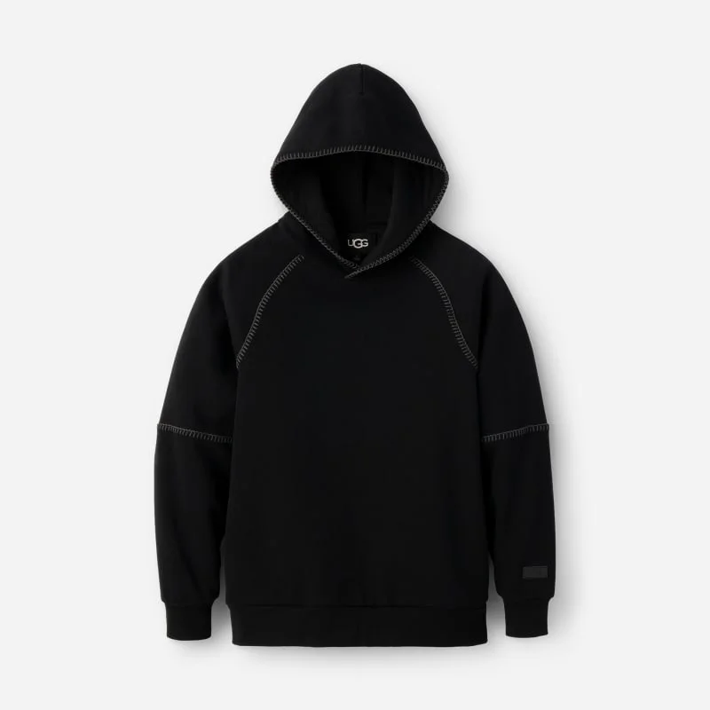 Our Classic Hoodie embodies the spirit of our Classic Boot in an equally cozy sweatshirt. Designed with brushed-back fleece, whipstitch detailing, and an overlapping neckline, this is one hoodie you won't want to lend out. We recommend pairing the Classic Hoodie with the Classic Sweatpant for an elevated level of UGG® comfort. Oversized-fit hooded sweatshirt. Self - 55% Responsible Cotton/45% recycled polyester. Rib Knit - 96% Responsible Cotton/4% elastane. Responsible Cotton means: responsible cotton sourcing scheme cotton, recycled cotton, or organic cotton. Lining - Unlined. Whipstitch detail on seams. Side seam pockets. The UGG® License Plate, leather label. 27 inch HPS length [size S]. 29 3/4 inch HPS [size 2X]. Pairs with the Classic Sweatpant. Imported. UGG® Women's Classic Hoodie Cotton Blend/Recycled Materials Hoodies & Sweatshirts in Black, Size XS