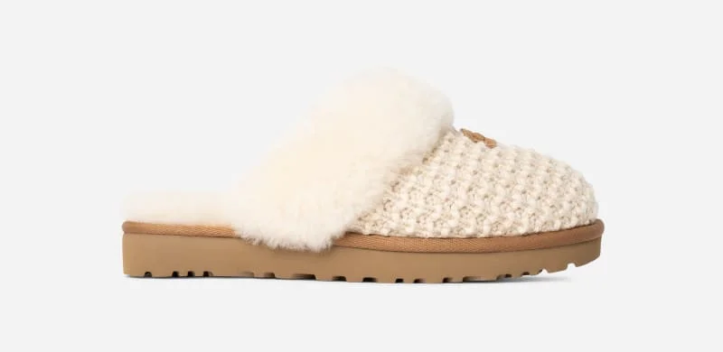 It's like slipping on a warm and super soft sweater. Wintercore at its finest, our Cozy Slipper has a sweater knit fabric across the outside and is fully lined with sheepskin. A fluffy collar finishes off this comfy-cozy look, and don't worry - this is a knit slipper for women that is super lightweight, with a durable outsole so you can be cozy-strong. Available in a range of dark and light neutral colors including black, grey, and cream. This product was made in a factory that supports women in our supply chain with the help of HERproject. This collaborative initiative creates partnerships with brands like ours to empower and educate women in the workplace. Soft-knit upper. Sheepskin collar. 17mm sheepskin lining. 17mm sheepskin insole. Sugarcane EVA outsole. Polyester binding or textile binding made from 100% recycled polyester fibers. Suede label with embossed The UGG® Logo, Woven label with The UGG® Logo on insole. RN 88276. This product contains real fur from sheep or lamb. Fur may be sourced from Australia, Ireland, the United Kingdom, or the United States. It has been artificially dyed and treated.. UGG® Women's Cozy Slipper Sheepskin Slippers in Grey/, Size 11