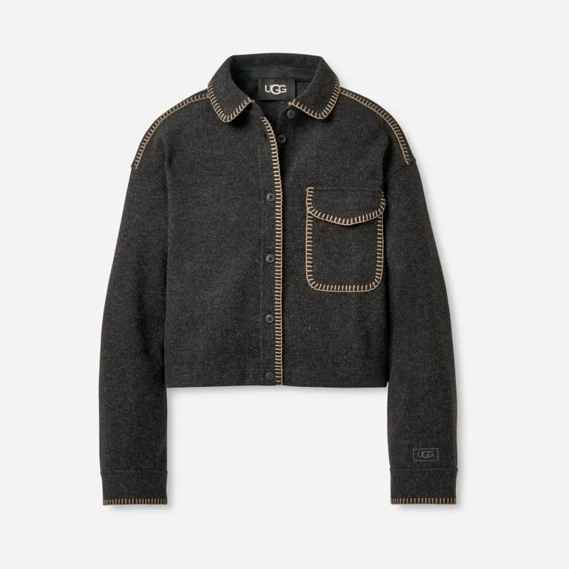 Lightly structured and soft to the touch, our Toria Jacket is made with a unique felted jersey that looks like wool yet wears like your favorite sweatshirt. Designed with contrasting whipstitch details and a slightly shrunken length, the Toria feels like a Heritage UGG® find with contemporary wearability.This product was made in a factory that supports women in our supply chain with the help of Reimagining Industry to Support Equality (RISE). This collaborative initiative creates partnerships with brands like ours to empower and educate women in the workplace. Relaxed-fit collared button-up jacket. Self - 93% Recycled Polyester/7% Livaeco Viscose. Lining - Unlined. Faux suede trim (100% Polyester). Whipstitch detail. Chest pocket with flap closure. Elastic hem at back. The UGG® Logo button at center placket and cuffs. Interior adjustable tabs with The UGG® Logo snaps. The UGG® License Plate embroidered label. 20 1/2 inch HPS Length [Size S]. Imported. This product was made in a factory that supports women in our supply chain with the help of Reimagining Industry to Support Equality (RISE). This collaborative initiative creates partnerships with brands like ours to empower and educate women in the workplace.. UGG® Women's Toria Jacket Polyester Tops in Black Heather, Size M
