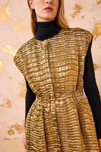 Opening the AW25 runway, the Agathe Coat is sculpted from Italian cloque fabric alive in wave-like textures that flicker with movement. This ornate gold coat exudes versatility, pairing beautifully over layers or on its own for a standout effect. - Metallic cloque - Model Height: 5'11" - Elastic waist - Sleeveless - Side pockets - Front zipper - Composition: 46% pure copper metallic yarn, 20% metallized polyester, 16% polyester, 8% acrylic, 7% silk, 3% polyamide - Delicate dry clean