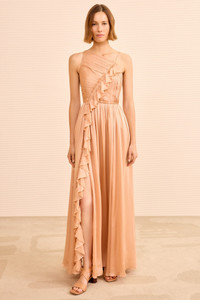 Ethereal in fabrication, the Aisha Gown is cut from airy chiffon in soft pink with a subtle, satin finish. This flowing gown is artfully sculpted with an asymmetric neckline that transforms into a gathered bodice with traveling, cascading ruffles. The split hemline lends graceful movement. - Satin-faced silk chiffon - Model Height: 5'10" - Gown - Lined - Concealed side zipper - Composition: 100% silk - Dry clean only