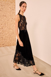 Imbued with poetic detailing, the Alita Skirt is made from lightweight black velvet with panels of mesh with floral ribbon embroidery. Perfect for elevated occasions, it is designed to sit high on the waist and gracefully skims to a midi-length hem. - Velvet - Model Height: 5'10" - Midi length, high-rise waist - Concealed side zipper - Composition: 75% viscose, 25% polyester - Dry clean only