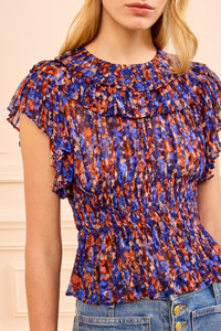 Alive in poetic detail, the Athene Top is made from crinkled chiffon with pleated ruffles framing the neckline and gathering that frames the waist. This multicolored top has an effortless silhouette that breathes with delicate botanicals inspired by traditional pointillism artwork. - Crinkled silk chiffon - Model Height: 5'11" - Designed with gathering at the bust that expands, fixed at the waist - Round neckline - Flutter short sleeves - Concealed side zipper, button keyhole at back - Composition: 100% silk - Dry clean only - Style# SP260212