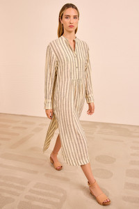 The Brita Coverup Dress evokes timeless ease, hand-loomed from Cowrie white cotton with multihued stripes that softly degrade. This lightweight, tunic-style shirtdress has a fluid fit and splits at the hem for effortless movement, beachside or poolside. - Hand-loomed cotton - Model Height: 5'10" - Designed for a loose fit - Long sleeves with button cuffs - Buttons along front - Composition: 100% cotton - Hand wash cold