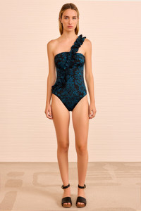 A signature silhouette, the Capri Maillot is imbued with baroque florals printed against a rich, midnight blue. This one-shoulder swimsuit captures the eye with a burst of ruffles that cascade asymmetrically and is ruched for a flattering fit. - Italian swim fabric - Model Height: 5'10" - One-shoulder neckline - Medium brief coverage - Composition: 80% polyamide, 20% elastane - Hand wash cold